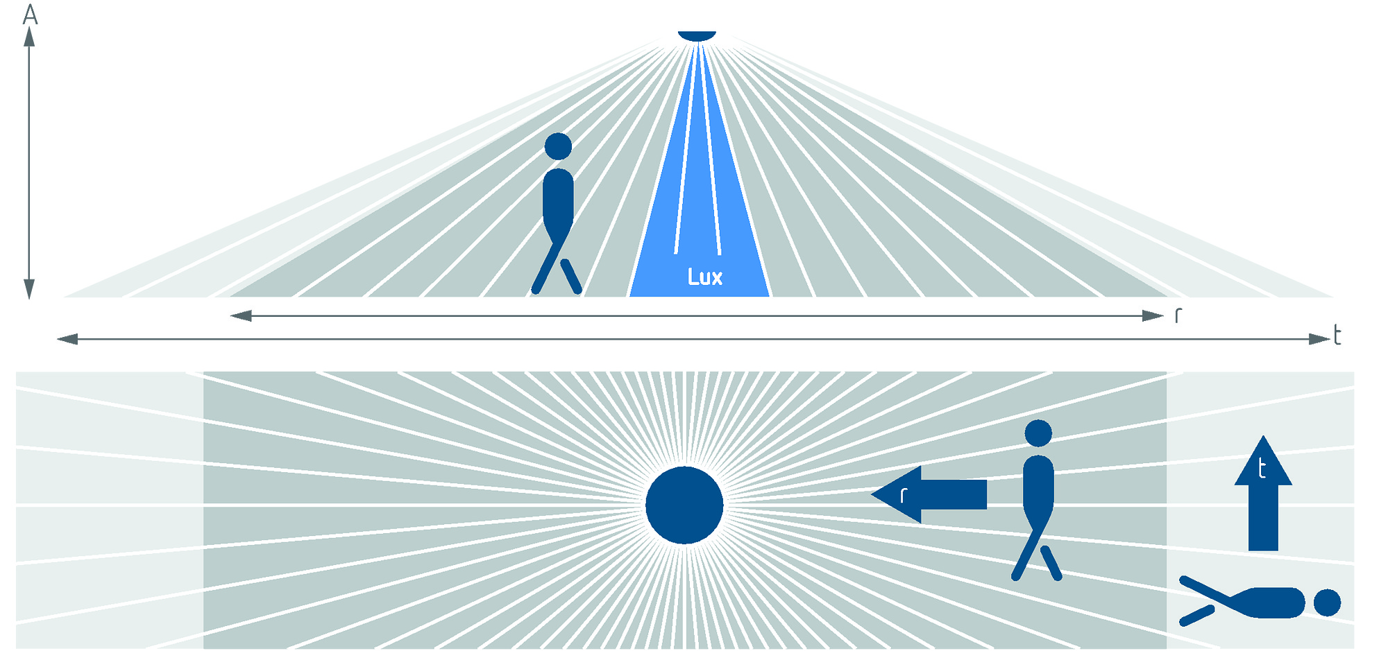 - Das Schaltverhalten des Präsenzmelders wird durch Anwesenheit und Helligkeit gesteuert.